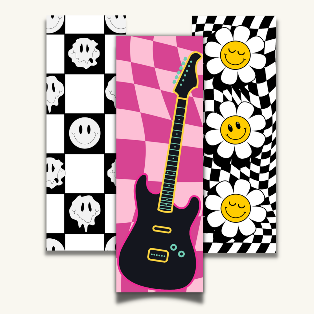 Gingham black and white BookMarks with flowers and happy face emoji and electric guitar